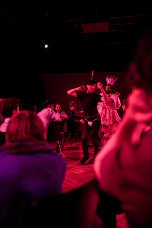 The performance examines the concepts of togetherness and companionship. It is an experience machine, in which items and people are repeatedly and pointlessly shuffled around. It is a journey through an imaginary wonderland where all the magic is fake and nothing seems as it appears. At the end, their choices are acknowledged with a reward or only with a promise of it, and consequently, the idea of collectivity is restored and looked upon with the new perspectives that are not just artistically represented, but directly relived.
