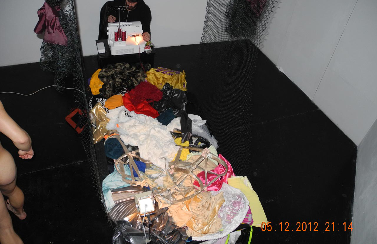 A naked performer lies in a bed full of costumes made over the years by a costume and stage designer and chews on a continuous line of thread coming out of the sewing machine.