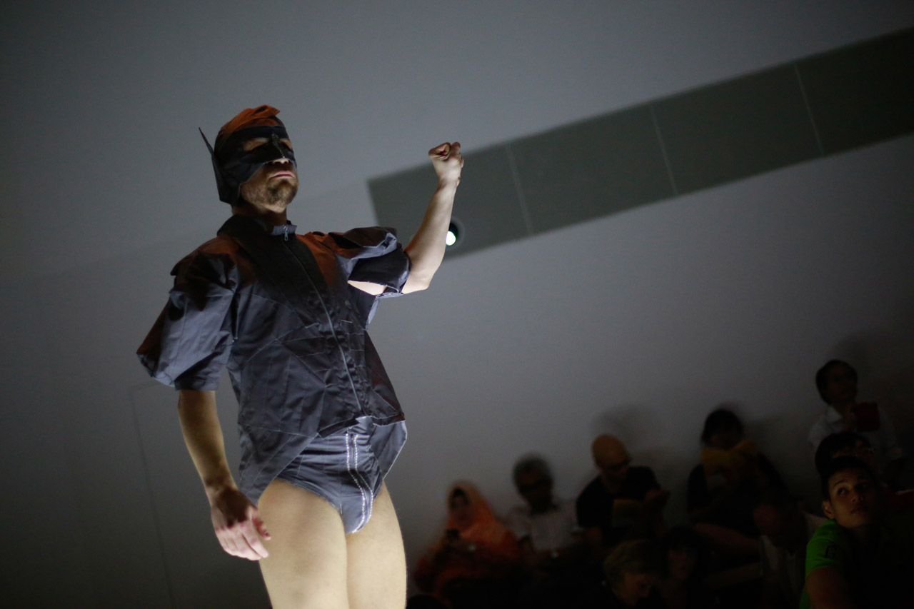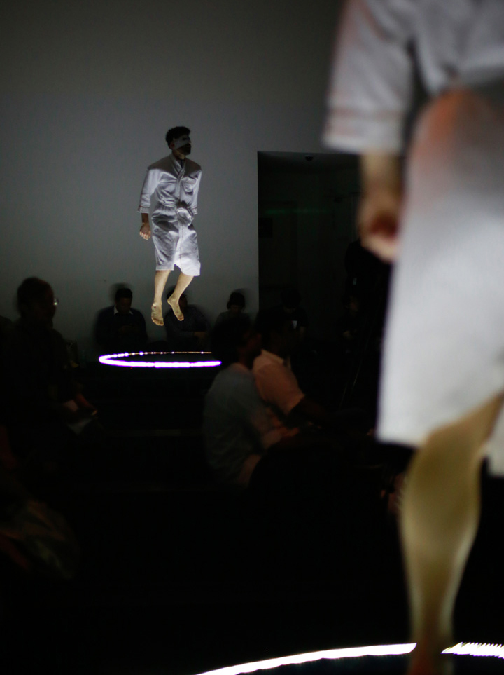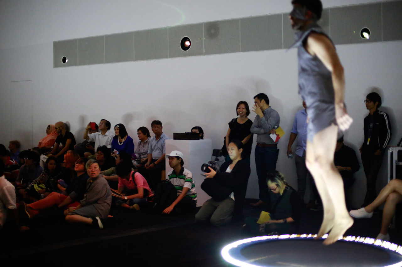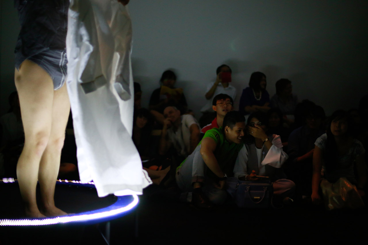 An "interactive choreography for two trampolines" that oscillates between the work of art as an object and that of an action. With the use of the trampolines as some nonsensical full-body gamepads living body becomes an extended operational system performing beyond the boundaries of its skin and beyond the local space that it inhabits.